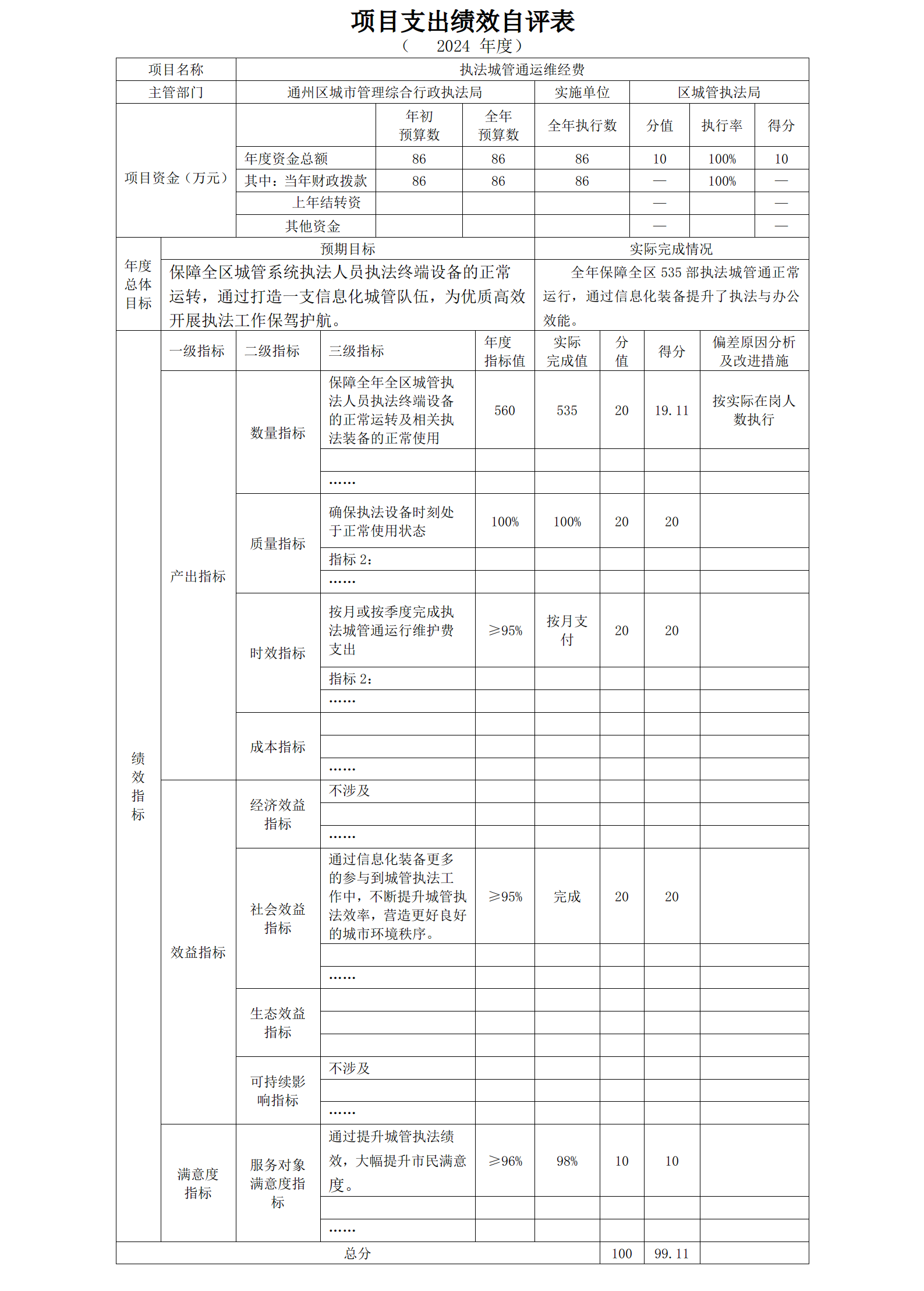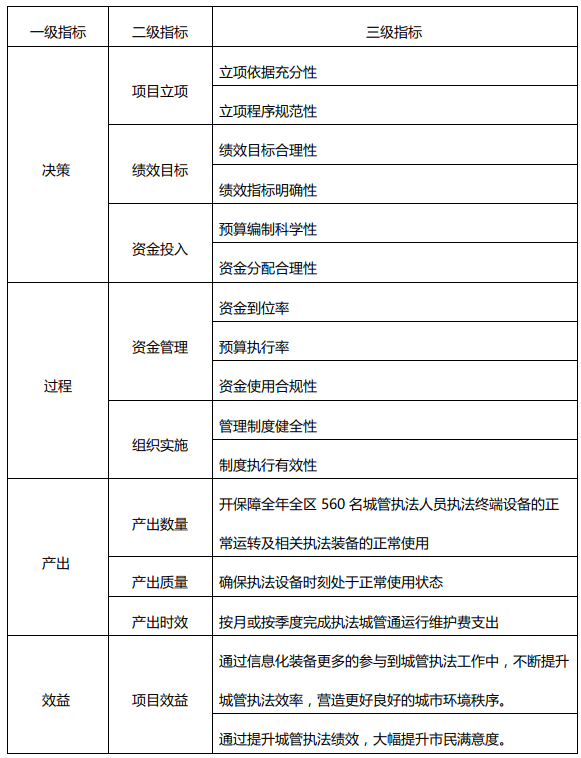 1.绩效评价目的、评价对象和范围。通过开展项目绩效评价,全面、客观、公正地评价财政资金预算执行情况和资金使用效益,及时发现预算编制、执行和管理中存在的问题,为改进预算管理、优化资源配置、提高财政资金使用效益提供依据。绩效对通州区城市管理综合行政执法局的执法城管通运维费用项目进行绩效评价。