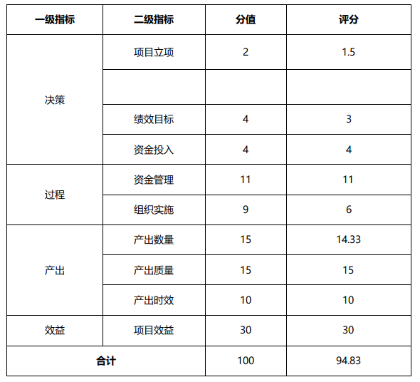 项目绩效评价得分为 94.83分,绩效评价级别为“优”。
