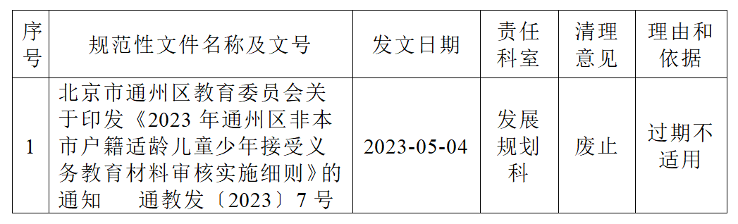 根据《北京市通州区司法局关于开展行政规范性文件清理工作的通知》,结合实际工作,我委对现存行政规范性文件进行了清理,经通州区教委行政办公会2025年第19次会议审议通过,现决定废止行政规范性文件1件。废止的行政规范性文件即日起不再执行。