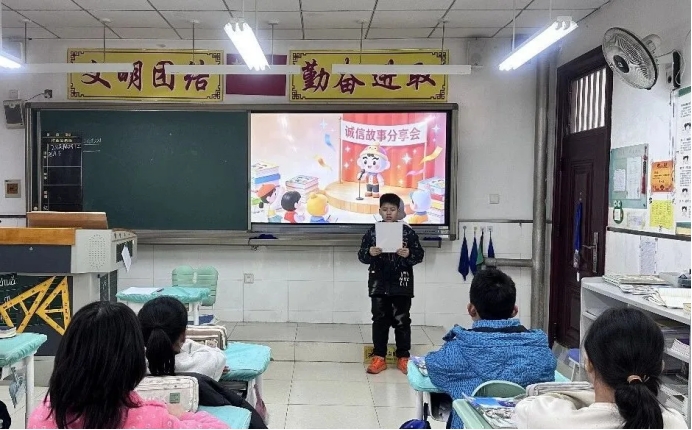 在“诚信小故事分享会”上,同学们踊跃登台,声情并茂地讲述《曾子杀猪》《狼来了》等经典故事,并结合自己的生活实际,分享守诚信、讲实话的亲身经历。分享结束后,师生共同制定班级诚信公约,张贴于教室醒目位置,引导同学们在日常行为中恪守承诺、言行一致。大课间,诚信主题儿歌回荡在校园每个角落,诚信理念在童声中悄然扎根,真正体现了“诚信立根、文化浸润”的教育初心。