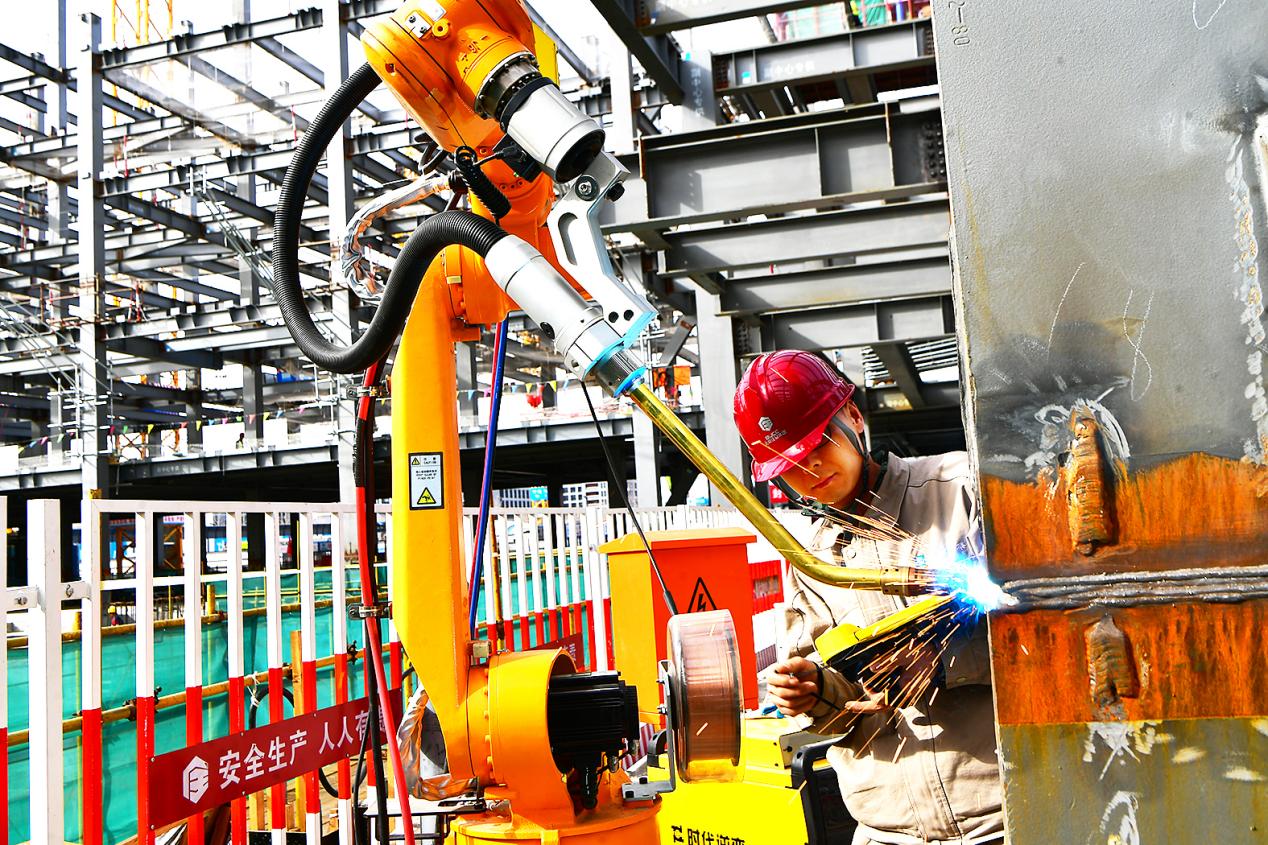 施工现场,一台焊接机器人成了好帮手。通过人工编程为它布置“任务”后,机器人可自动完成焊接。